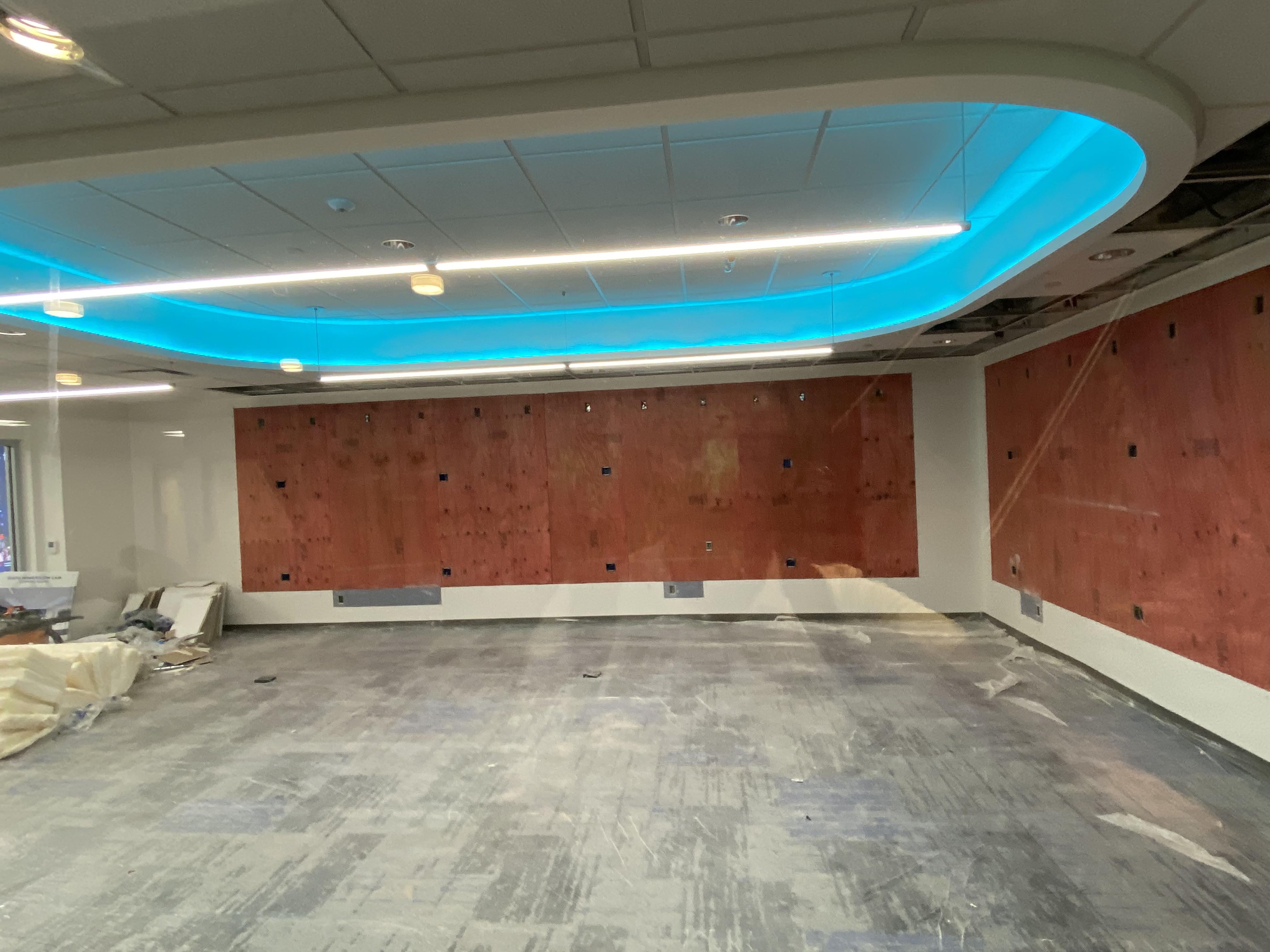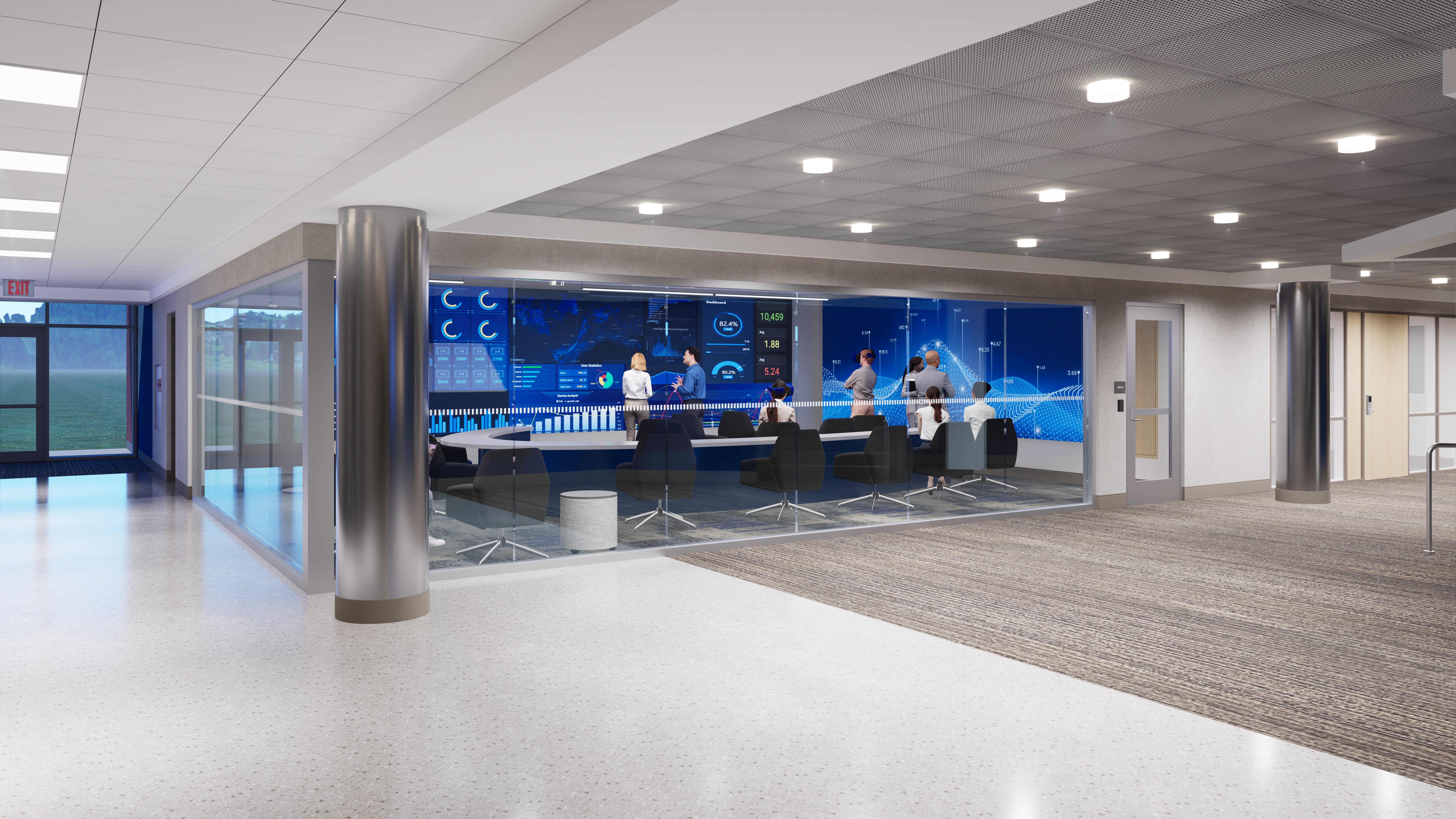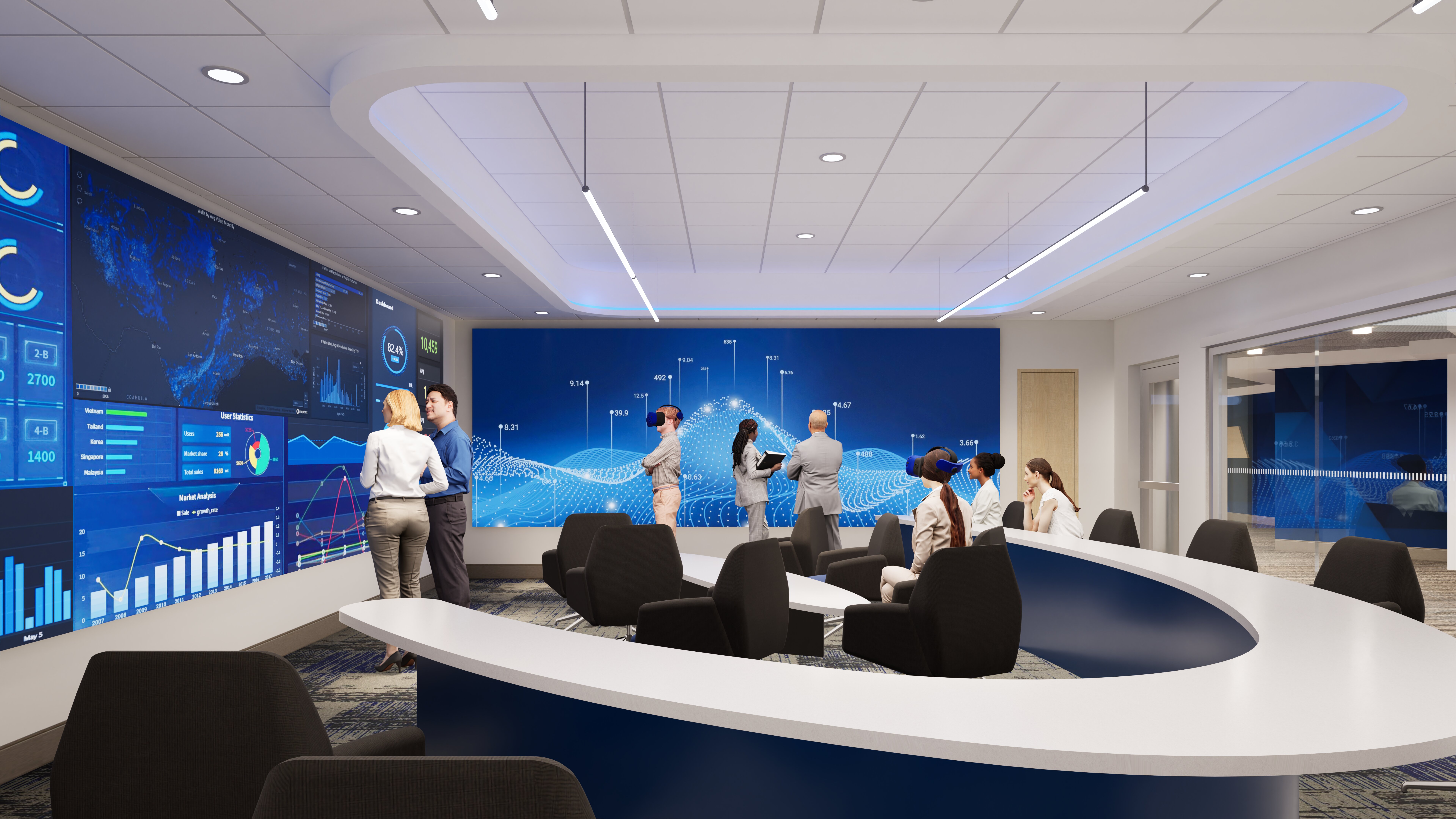 PROJECT: A new 3D visualization lab for 30 students with a 32-foot wide video wall. The space includes 3 team rooms for design competition work. Design Features include color LED lights, LED wall reveals, and electric privacy glass.