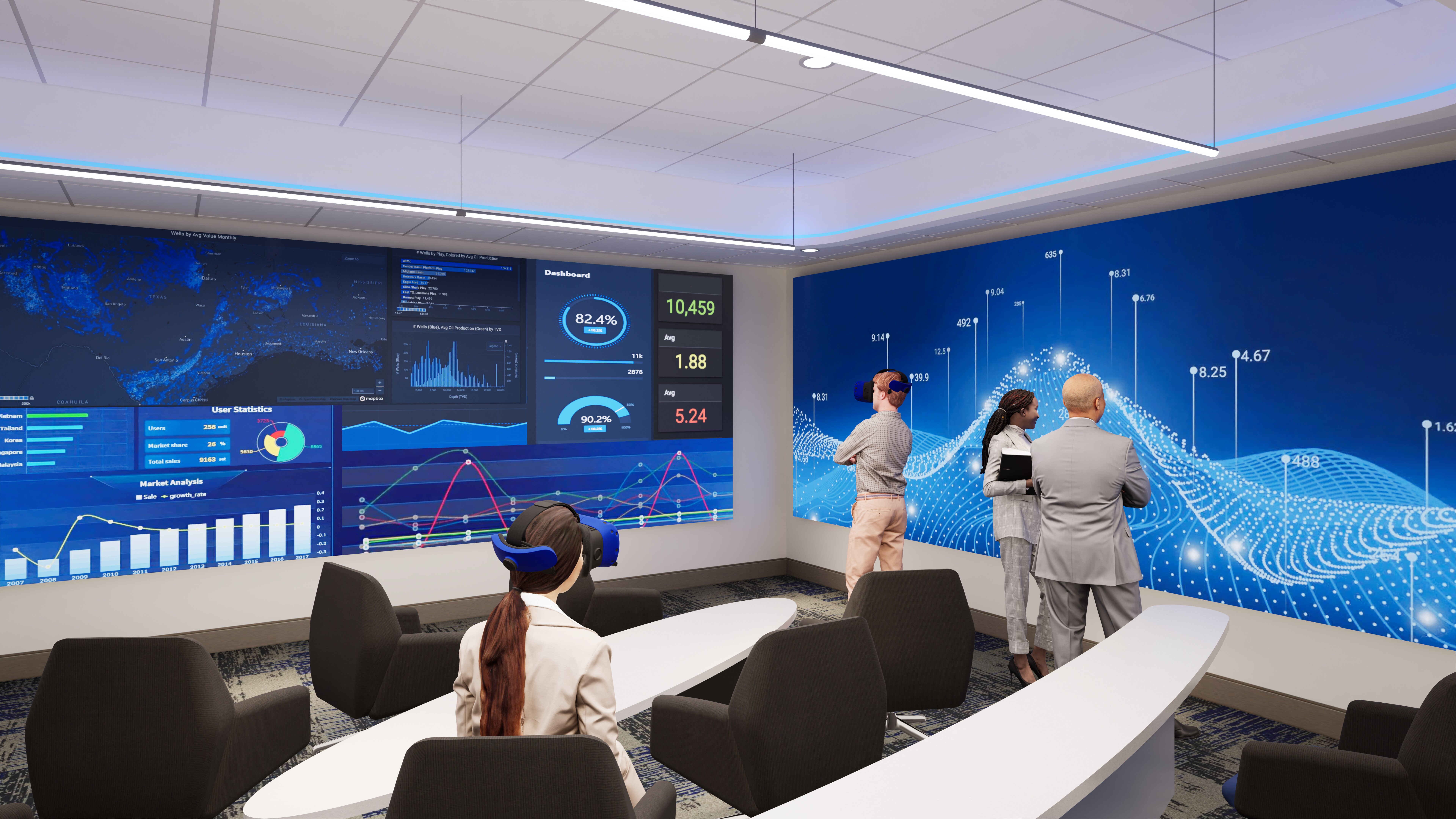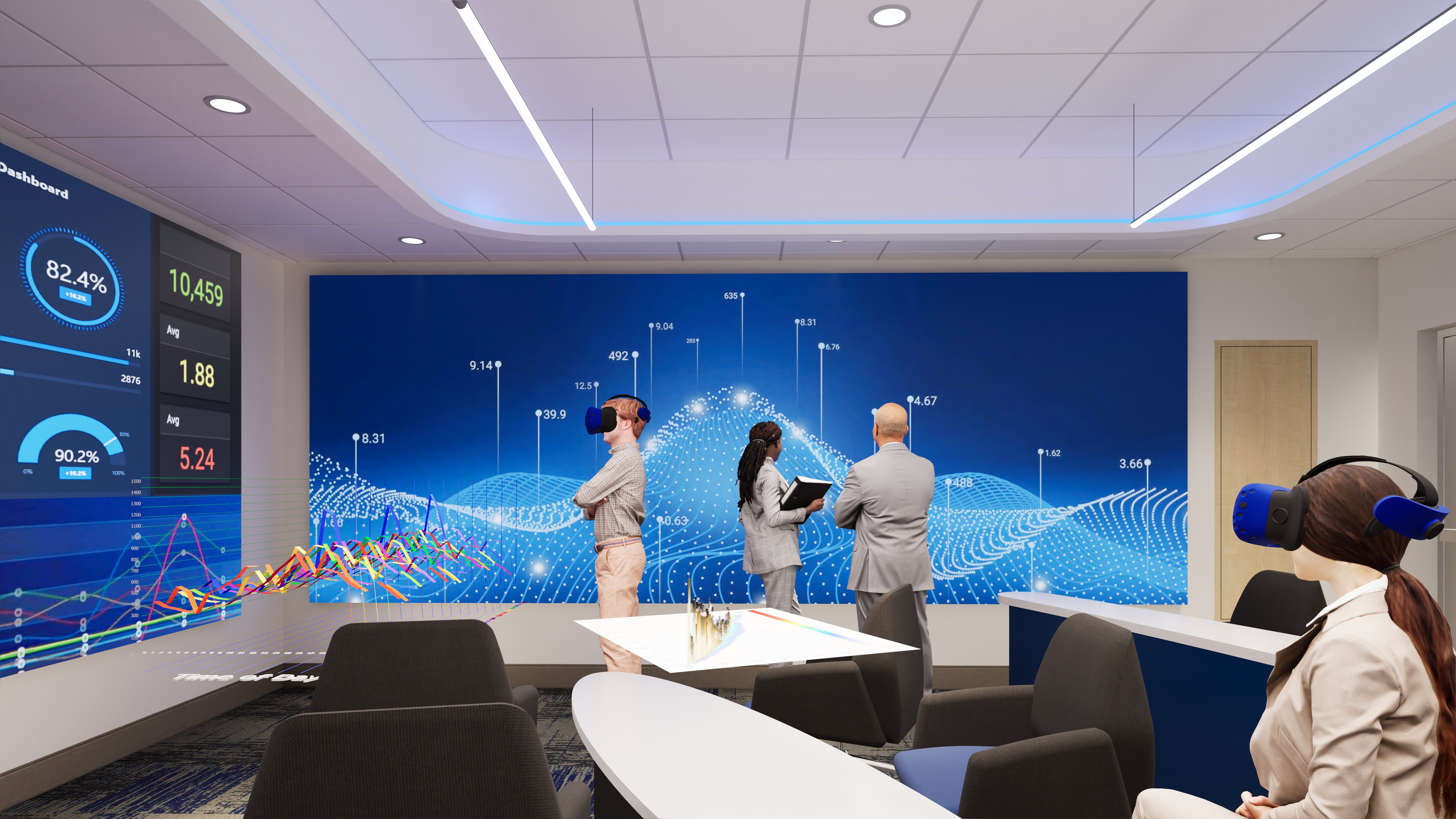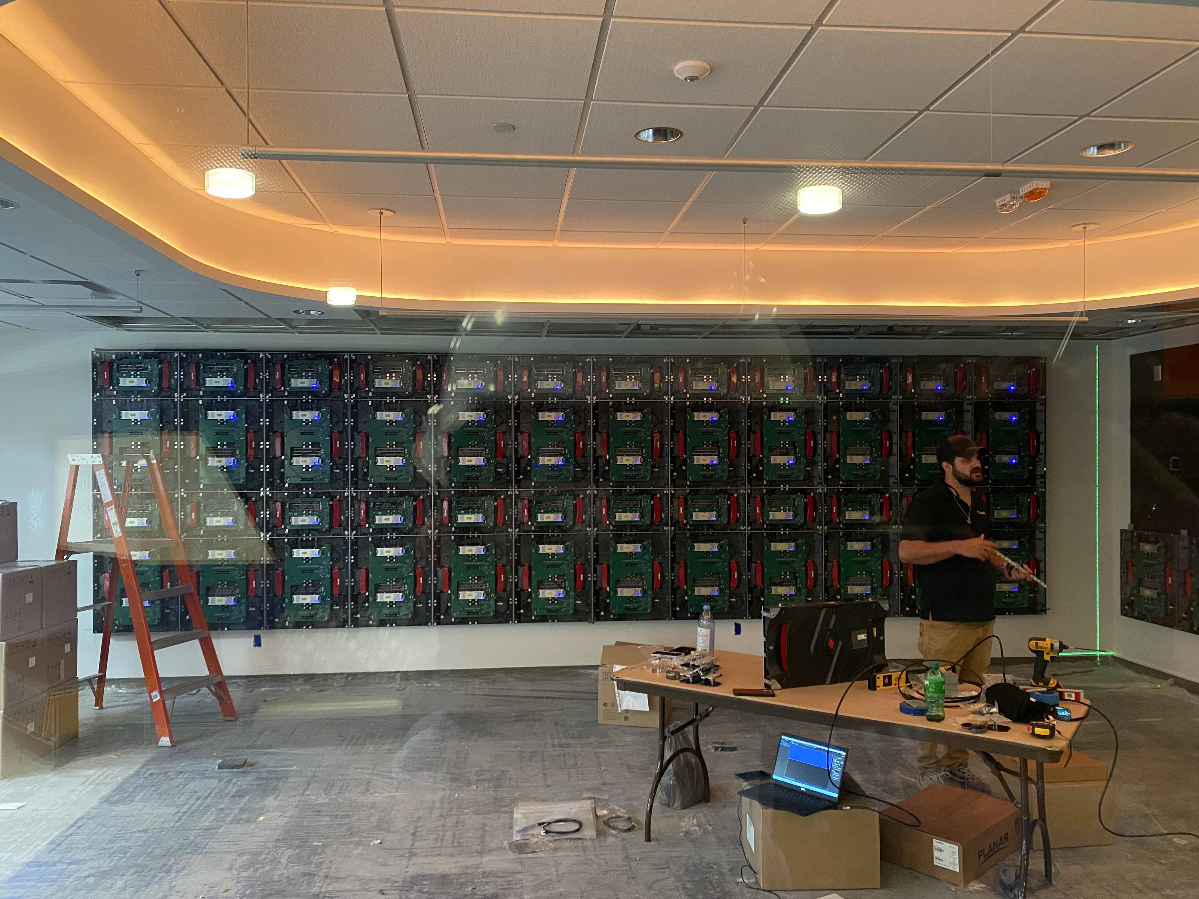 PROJECT: A new 3D visualization lab for 30 students with a 32-foot wide video wall. The space includes 3 team rooms for design competition work. Design Features include color LED lights, LED wall reveals, and electric privacy glass.